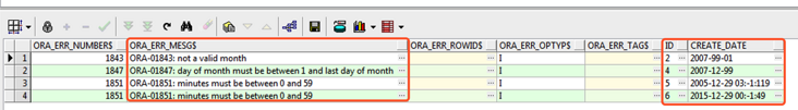 EXEC DBMS_ERRLOG.CREATE_ERROR_LOG('T1','T1_ERROR','DEMO');创建并插入数据到临时表,验证时间数据有效性