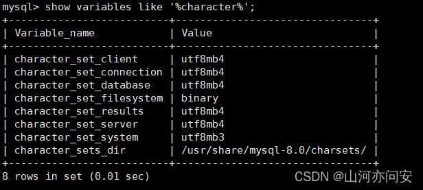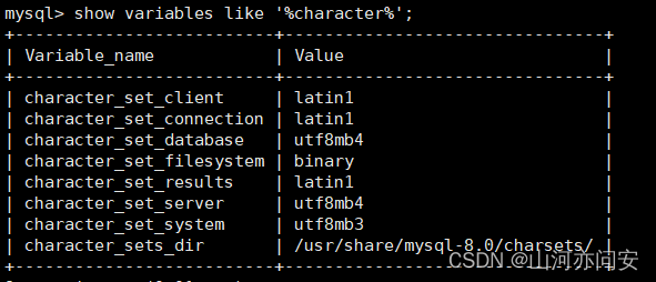 然后看一下mysql的字符集,已经变成 utf8mb4 了,这样就可以解决中文乱码问题了。