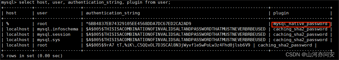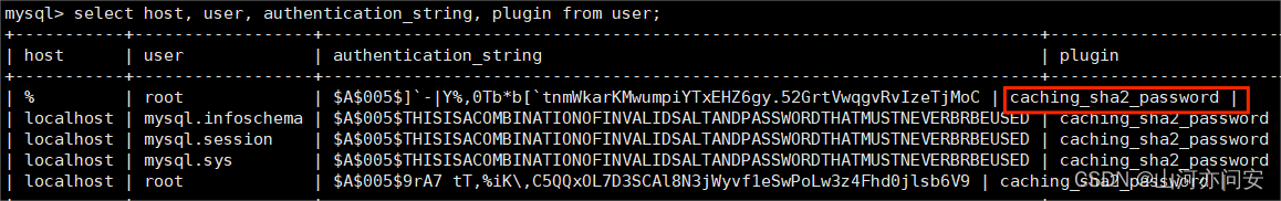 select host, user, authentication_string, plugin from user; #查看root用户登录加密方式
