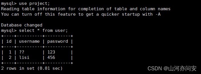 CREATE DATABASE /*!32312 IF NOT EXISTS*/`project` /*!40100 DEFAULT CHARACTER SET utf8mb4 COLLATE utf8mb4_general_ci */ /*!80016 DEFAULT ENCRYPTION='N' */; USE `project`; /*Table structure for table `user` */ DROP TABLE IF EXISTS `user`; CREATE TABLE `user` ( `id` BIGINT NOT NULL AUTO_INCREMENT, `username` VARCHAR(20) DEFAULT NULL, `password` VARCHAR(20) DEFAULT NULL, PRIMARY KEY (`id`) ) ENGINE=INNODB AUTO_INCREMENT=3 DEFAULT CHARSET=utf8mb4 COLLATE=utf8mb4_0900_ai_ci; /*Data for the table `user` */ INSERT INTO `user`(`id`,`username`,`password`) VALUES (1,'张三','123'),(2,'lisi','456');