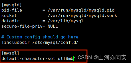 3. 在 my.cnf文件中[mysql] 下面添加 default-character-set=utf8mb4,然后 :wq 退出。没有 [mysql] 的话就写一个。