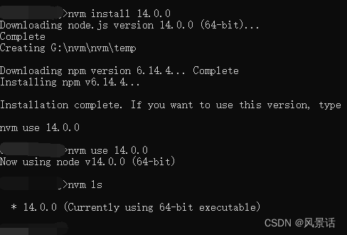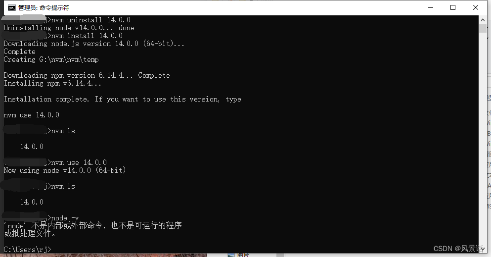 一切正常,输入nvm install 14.0.0安装node,接着输入nvm ls查看node版本,发现当前use的node版本号前面没了*,而且输入node -v 也报错了。