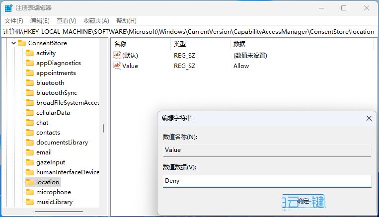 5、最后,只需要双击名为【Value】的字符串值,将其设置为【Deny】;
