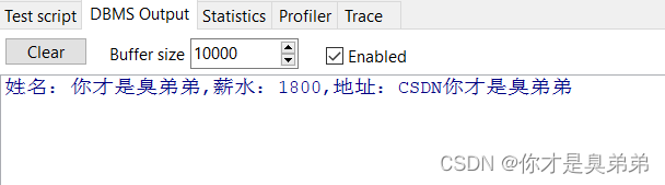 DBMS_OUTPUT.PUT_LINE('姓名:' || V_NAME || ',薪水:' || V_SAL || ',地址:' ||V_ADDR);