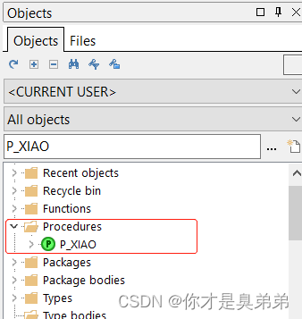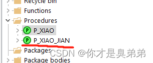 - 注意点击△执行后 会进行存储 ,Procedures 中会以P_XIAO 这个名称进行存储。