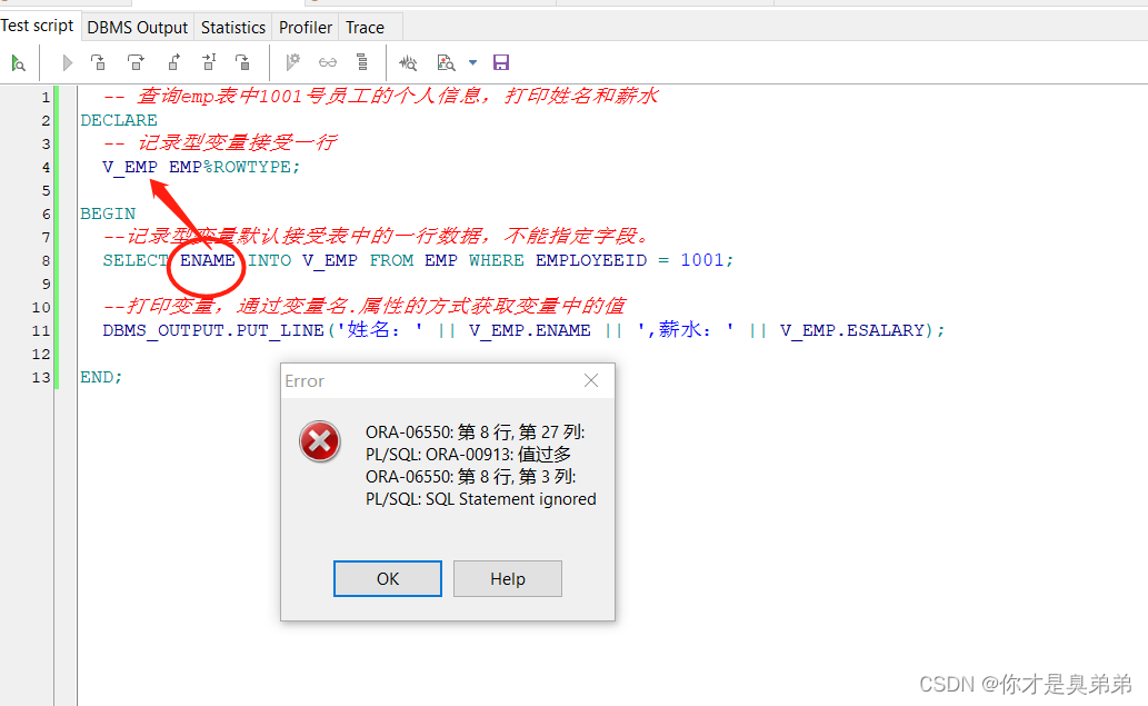 - 普通型变量: V_NAME VARCHAR2(30); 你怎么知道一定VARCHAR2类型,你又怎么知道长度一定是30呢,假设V_NAME VARCHAR2(1); 就对应不上SELECT ENAME, ESALARY INTO V_NAME, V_SAL FROM EMP 这条语句中的 ENAME 的长度了,也就接收不到值了,就会报错。如果要使用普通变量前提是 ,了解查询表中对应字段的 类型 及 长度, 才能基于他们来确定类型长度 这比较繁琐。