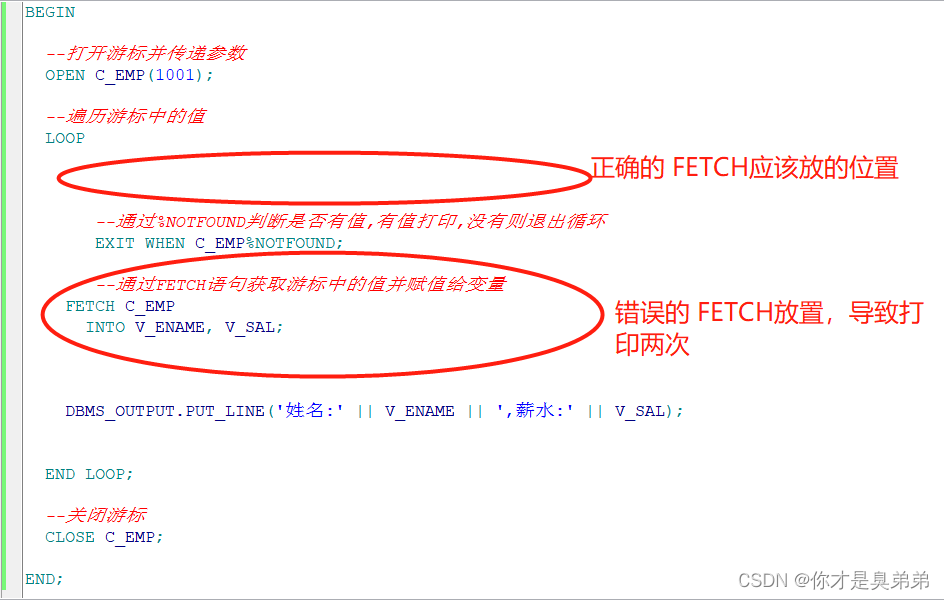 EXIT WHEN C_EMP%NOTFOUND; 判断有值打印,出去之后 又带着有值的进入到循环中 EXIT WHEN C_EMP%NOTFOUND; 判断没值打印, 所以这次打印的是上次值的。注意存放的位置。