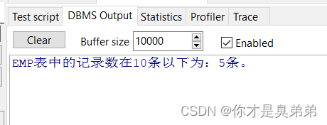 DBMS_OUTPUT.PUT_LINE('EMP表中的记录数在10~20条之间为:' || V_COUNT || '条。');