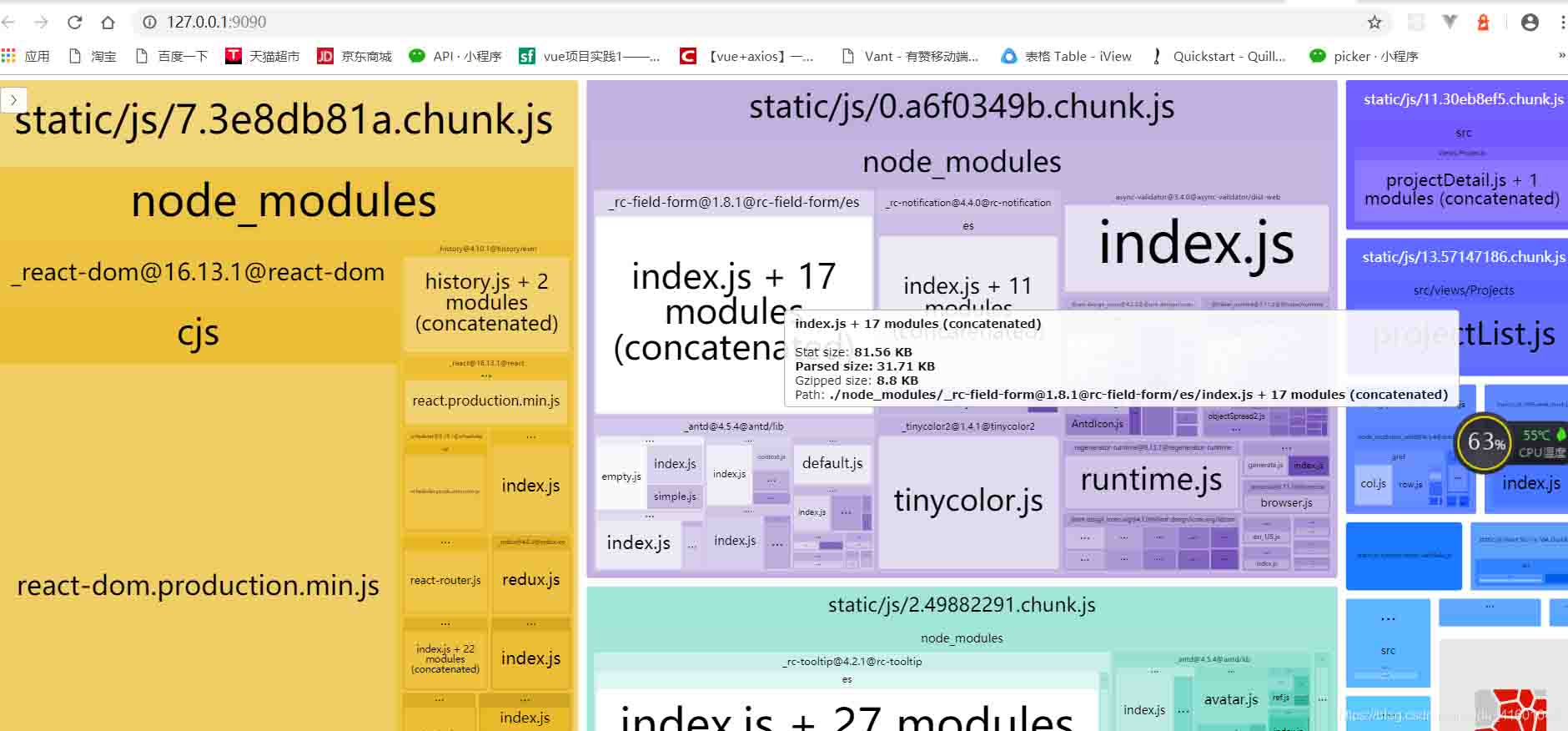 这样我们在npm run build的时候浏览器会自动打开9090端口的一个页面显示当前依赖包的各种大小拼图