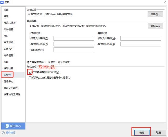 第五步:点击“安全性”,取消“打开或保存时标记可见”勾选,点击“确定”。