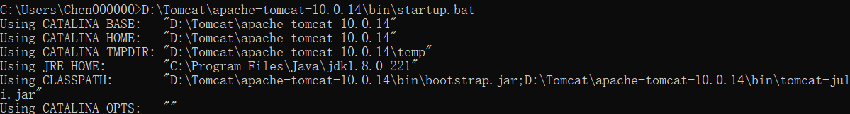 2.通过打开命令提示符在其中输入startup的相当路径,来判断电脑上是否已经成功安装tomcat,且tomcat配置的环境变量有没有错误。将startup直接拽进去命名提示符中,回车显示的内容如果与下面图片中出现的一样,则说明tomcat配置的环境变量没有问题。