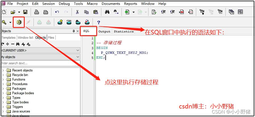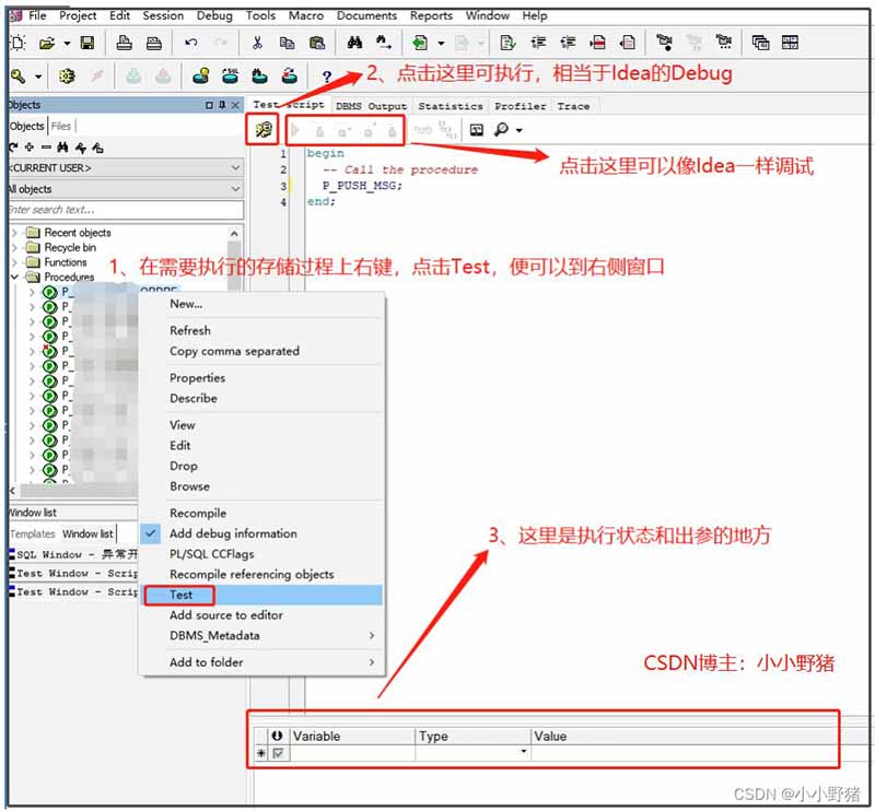 -- 方式三,在PL/SQL Developer的Test窗口中执行,可执行debug,或者编译(下有图)