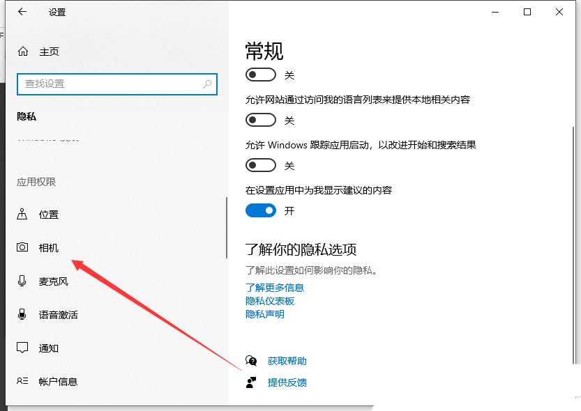 3、隐私主页设置窗口,找到【相机】,并点击打开;