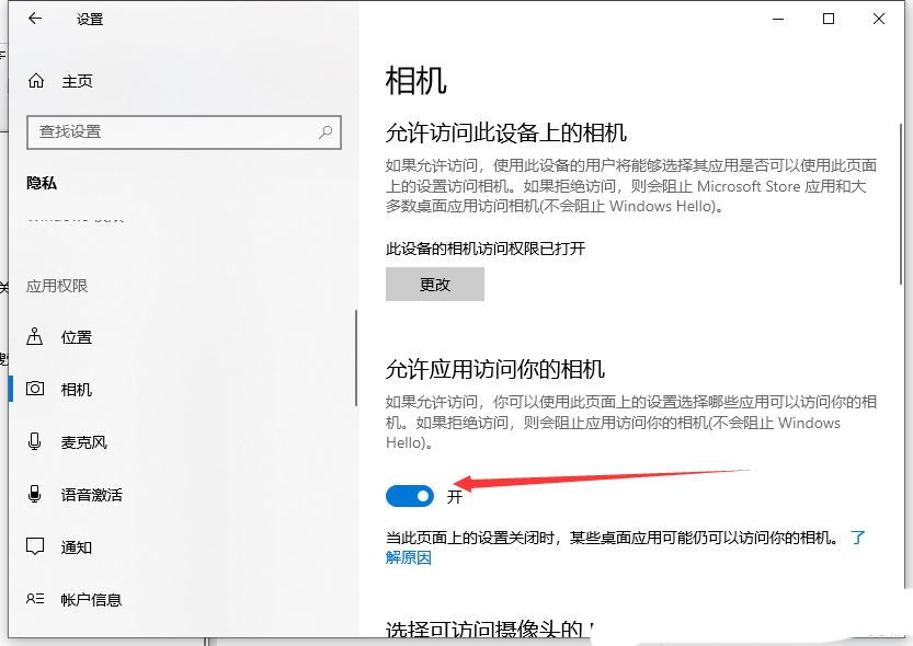 允许应用访问你的相机,如果允许访问,你可以使用此页面上的设置选择哪些应用可以访问你的相机。如果拒绝访问,则会阻止应用访问你的相机(不会阻止 Windows Hello)
