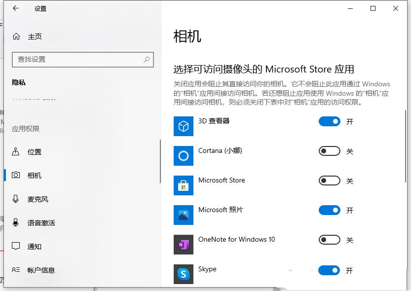 4、相机,选择可访问摄像头的 Microsoft Store 应用,关闭应用会阻止其直接访问你的相机。它不会阻止此应用通过 Windows 的相机应用间接访问相机。若还想阻止应用使用 Windows 的相机应用间接访问相机,则必须关闭下表中对相机应用的访问权限;