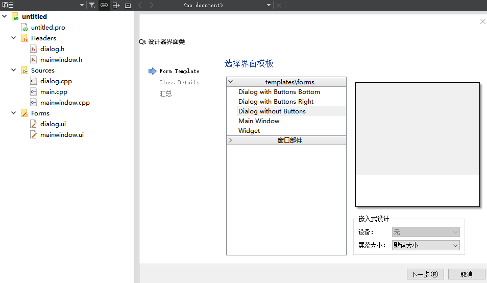 此时直接点击下一步按钮,并选中Forms/dialog.ui