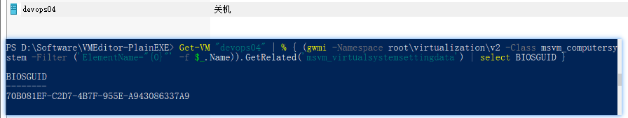 (Get-WmiObject -Namespace root\virtualization\v2 -Class Msvm_VirtualSystemSettingData -Filter "ElementName='devops04'").BIOSGUID