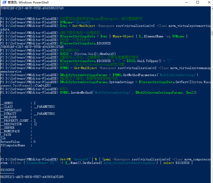 Get-VM "devops04" | % { (gwmi -Namespace root\virtualization\v2 -Class msvm_computersystem -Filter ('ElementName="{0}"' -f $_.Name)).GetRelated('msvm_virtualsystemsettingdata') | select BIOSGUID }