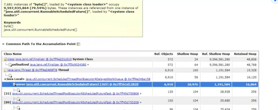 并发写入,用到了ScheduledThreadPool ,创建了大量线程 gc无法回收线程中内存导致内存不够用了。