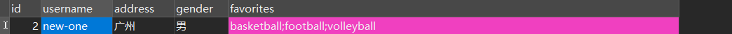首先建立了一个t_user表存储用户信息,这个表中有一栏favorites是记录个人爱好的,爱好包括篮球、足球、排球:
