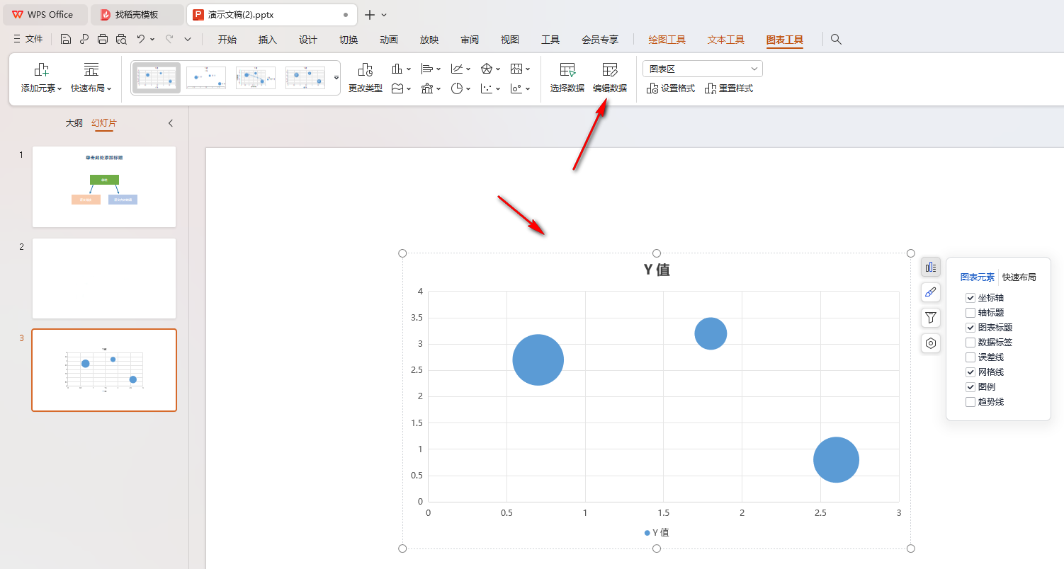 4.随后,可以查看到当前幻灯片上插入了一个气泡图样式了,我们可以点击工具栏中的【编辑数据】按钮。