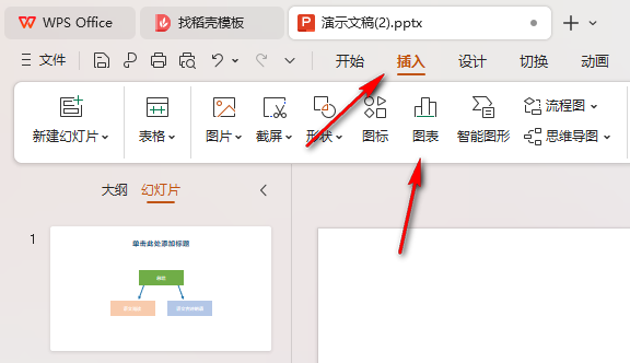 1.首先,我们进入到新建的幻灯片页面中,将【插入】选项进行点击,然后选择工具栏中的【图表】选项。