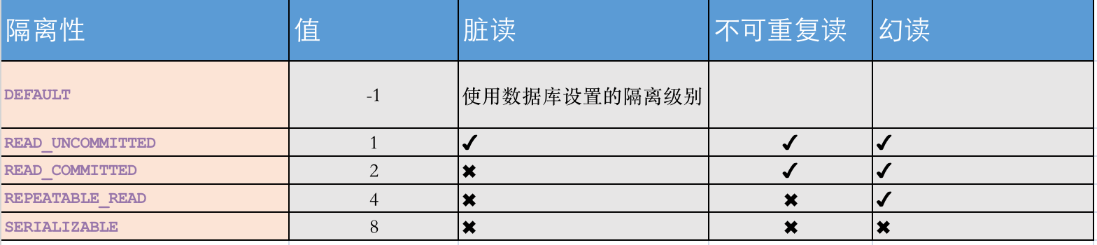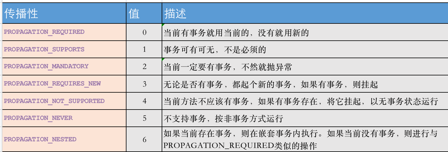 public interface TransactionDefinition { int PROPAGATION_REQUIRED = 0; int PROPAGATION_SUPPORTS = 1; int PROPAGATION_MANDATORY = 2; int PROPAGATION_REQUIRES_NEW = 3; int PROPAGATION_NOT_SUPPORTED = 4; int PROPAGATION_NEVER = 5; int PROPAGATION_NESTED = 6; //默认隔离级别,和数据库的隔离级别一致 int ISOLATION_DEFAULT = -1; int ISOLATION_READ_UNCOMMITTED = 1; int ISOLATION_READ_COMMITTED = 2; int ISOLATION_REPEATABLE_READ = 4; int ISOLATION_SERIALIZABLE = 8; //默认不超时 int TIMEOUT_DEFAULT = -1; }