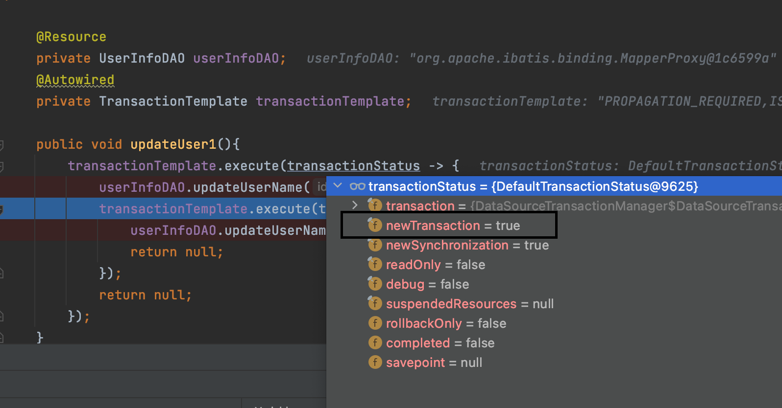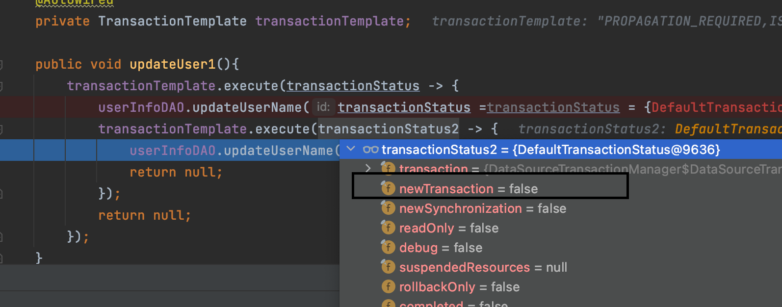 @Service public class UserInfoService { @Resource private UserInfoDAO userInfoDAO; @Autowired private TransactionTemplate transactionTemplate; public void updateUser1(){ transactionTemplate.execute(transactionStatus -> { userInfoDAO.updateUserName(1,"zhangsanfeng"); transactionTemplate.execute(transactionStatus2 -> { userInfoDAO.updateUserName(2,"lisi"); return null; }); return null; }); } }